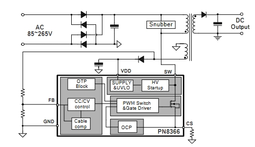 PN8366為原邊反饋工作模式,可省略光耦和TL431。內(nèi)置高壓啟動(dòng)電路,可實(shí)現(xiàn)芯片空載損耗(230VAC)小于30mW。在恒壓模式,采用準(zhǔn)諧振與多模式技術(shù)提高效率并消除音頻噪聲,使得系統(tǒng)滿足6級(jí)能效標(biāo)準(zhǔn),可調(diào)輸出線補(bǔ)償功能能使系統(tǒng)獲得較好的負(fù)載調(diào)整率;在恒流模式,輸出電流和功率可通過CS腳的電阻進(jìn)行調(diào)節(jié)。該芯片提供了極為全面的智能保護(hù)功能,包含逐周期過流保護(hù)、過壓保護(hù)、開環(huán)保護(hù)、過溫保護(hù)、輸出短路保護(hù)和CS開/短路保護(hù)等。
