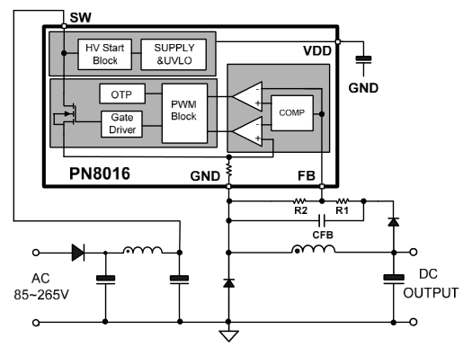 PN8016SSC-R1B集成PFM控制器及800V高雪崩能力智能功率MOSFET,用于外部元器件極精簡的小功率非隔離開關電源,輸出電壓可通過FB電阻調整。PN8016內置800V高壓啟動與自供電模塊,實現(xiàn)系統(tǒng)快速啟動、超低待機、自供電功能。該芯片提供了完整的智能化保護功能,包括過載保護,欠壓保護,過溫保護。另外PN8016的降頻調制技術有助于改善EMI特性。