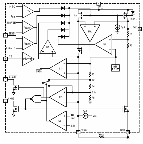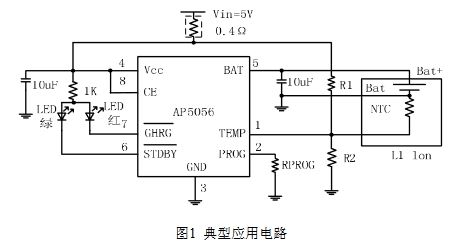 充電電壓被固定在4.2V,充電電流可通過外部電阻設(shè)置。當(dāng)充電電流在達(dá)到最終浮充電壓之后降至設(shè)定值 1/10 時(shí),AP5056 將自動(dòng)終止充電循環(huán)。當(dāng)輸入端(適配器或USB電源)拔掉后,AP5056自動(dòng)進(jìn)入低電流狀態(tài),電池漏電流將降到2μA以下。AP5056還可被設(shè)置于停機(jī)狀態(tài),使電源電流降到50μA。其余特性包括:電池溫度監(jiān)測(cè),欠壓鎖閉,自動(dòng)再充電和兩個(gè)狀態(tài)引腳以顯示充電和充電終止。