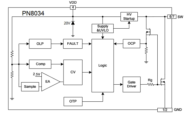 PN8034NSC-T1集成PFM控制器及650V高雪州能力智能功本MOSFET,用于外圖元器件極精簡的小功本非隔離開關(guān)電源。PN8034內(nèi)置高壓啟動模塊,實現(xiàn)系統(tǒng)快速啟動,超低待機功能。該芯片提供了完整的智能化保護功能,包括過流保護,欠壓保護,過溫保護。另外PN8034的降頻調(diào)制技術(shù)有助于改曾EMI特性。