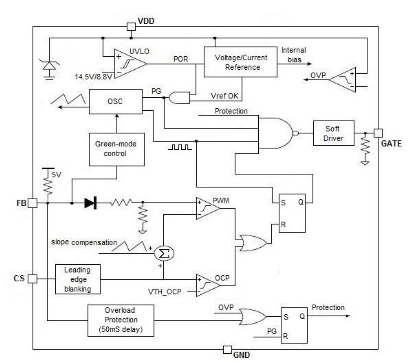該系列同時(shí)提供多種保護(hù)功能,主要包括OVP、OCP. OLP等。為了防止外部功率MOS管柵極因高壓損毀,該系列的驅(qū)動(dòng)輸出被鉗位在15V。