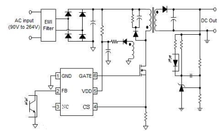芯片通過(guò)對(duì)輸出采樣并反饋到光耦獲得高精度的恒壓輸出。內(nèi)置的斜串補(bǔ)償電路確保了峰值電流模控制的穩(wěn)定性。內(nèi)部集成的頻率抖動(dòng)功能可以改善EMC.降低EMI濾波成本。