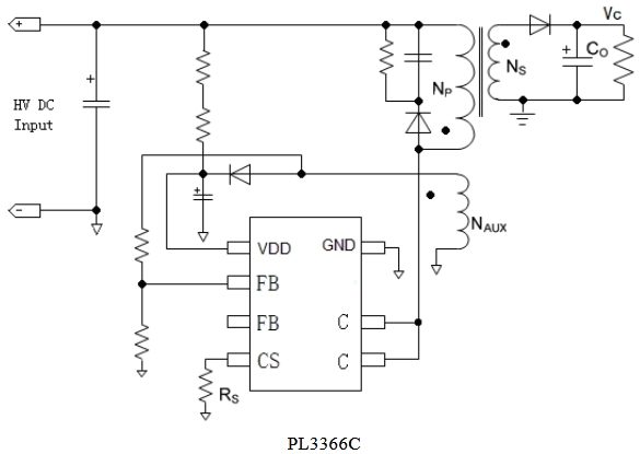 PL3366C的復(fù)合模式的應(yīng)用使芯片能夠?qū)崿F(xiàn)低靜態(tài)功耗、低音頻噪音、高效率。滿載時芯片工作在PFM模式,隨著負(fù)載降低,芯片會逐漸進(jìn)入到綠色模式,以提高整個系統(tǒng)的效率。PL3366C 同時具有多種保護(hù)功能:逐周期峰值電流檢測、VDD 欠壓/過壓保護(hù)、輸出過壓保護(hù)、輸出短路保護(hù)和過溫保護(hù)等