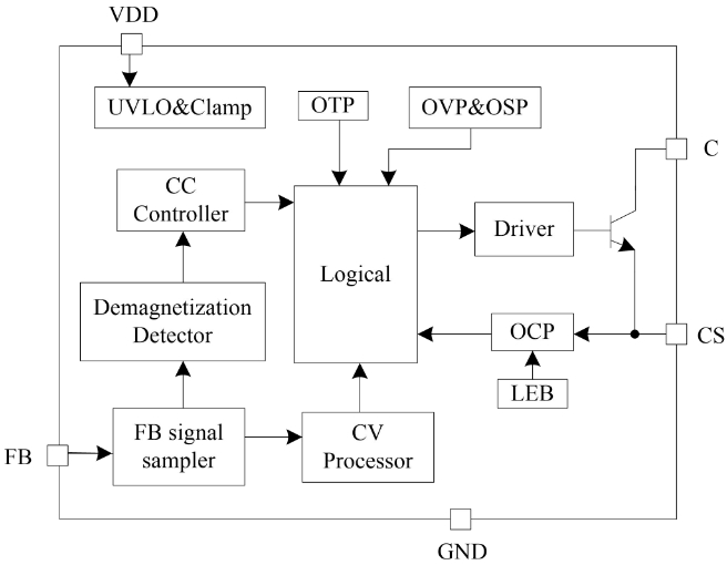 PL3369C(x)是一系列原邊控制,用于反激式開關(guān)電源的恒流/恒壓調(diào)節(jié)器。其高度集成了功率開關(guān),并通過去除光耦以及次級控制電路,在簡化充電器/適配器等傳統(tǒng)的恒流/恒壓設(shè)計的同時實現(xiàn)了精確的電流和電壓調(diào)節(jié),內(nèi)部框架圖如下圖所示。