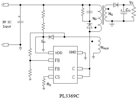 PL3369C 同時具有多種保護(hù)功能:逐周期峰值電流檢測、VDD 欠壓/過壓保護(hù)、輸出過壓保護(hù)、輸出短路保護(hù)和過溫保護(hù)等。