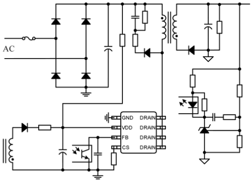 芯片通過(guò)對(duì)輸出采樣并反饋到光耦獲得高精度的恒壓輸出。內(nèi)置的斜率補(bǔ)償電路確保了峰值電流模控制的穩(wěn)定性。內(nèi)部集成的頻率抖動(dòng)功能可以改善EMC,降低EMI濾波成本。