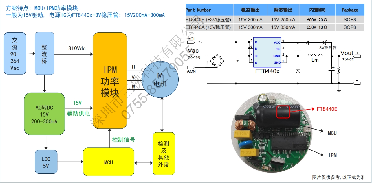 方案特點(diǎn):MCU+IPM功率模塊一般為15V驅(qū)動(dòng),電源1C為FT8440x+3V穩(wěn)壓管:15V200mA-300mA