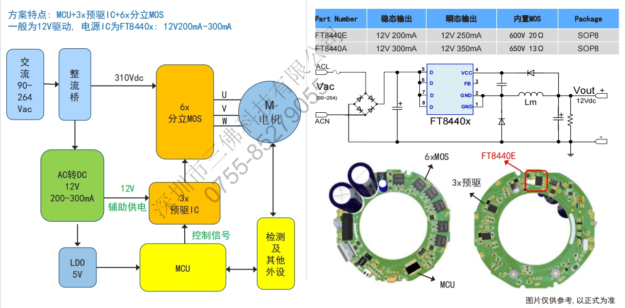 方案特點(diǎn):MCU+3x預(yù)驅(qū)IC+6x分立MOS一般為12V驅(qū)動(dòng),電源IC為FT8440x:12V200mA-300mA