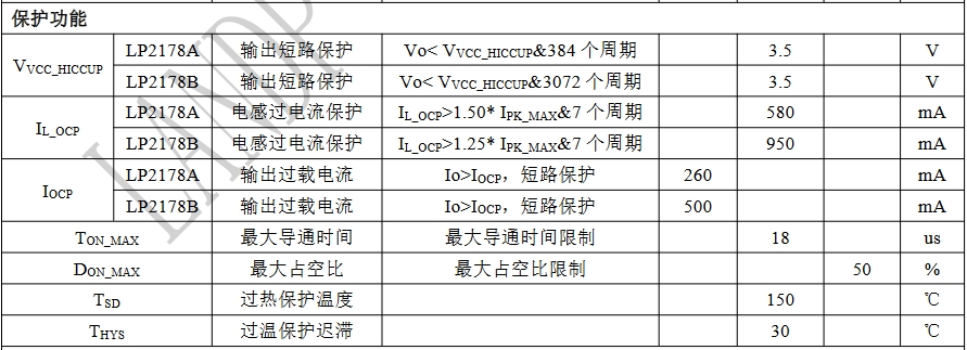 LP2178A和LP2178B均具備多重保護功能,包括VCC鉗位/欠壓保護、輸出短路保護、電感過電流保護及過溫保護等。
