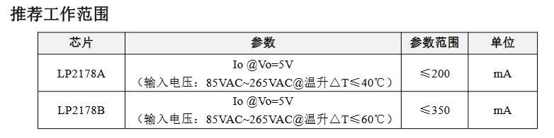 LP2178A在5V輸出電壓下,輸入電壓范圍為85VAC至265VAC,溫升△T≤40℃時,輸出電流能力為≤200mA。LP2178B在相同條件下,輸出電流能力為≤400mA,是LP2178A的兩倍,適合需要更大輸出電流的應用。