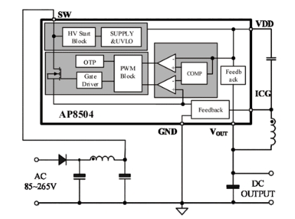 AP8505同樣基于高壓同步整流架構(gòu),集成PFM控制器以及500V高可靠性MOSFET,用于外圍元器件極精簡(jiǎn)的小功率非隔離開(kāi)關(guān)電源。AP8505的特點(diǎn)包括: