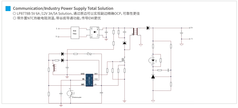 對(duì)于12W至24W的低功率應(yīng)用,SSR MOS Combo提供了一種高效的解決方案。LP8728ML、LP8728MD和LP8728AD/BD系列PWM控制器,配合LP15R060SD SR控制器,能夠提供穩(wěn)定的12V輸出,電流從1A到2A不等。這些組合特別適合于需要穩(wěn)定低壓電源的通信設(shè)備。