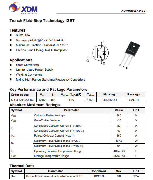 XD040Q065AY1S3芯達(dá)茂 國產(chǎn)IBGT +FRD單管 40A 650V TO-247-3L