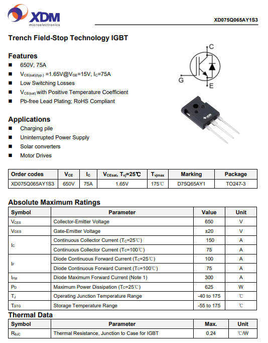 XD075Q065AY1S3 芯達(dá)茂國產(chǎn)IBGT +FRD單管75A 650V TO-247-3L